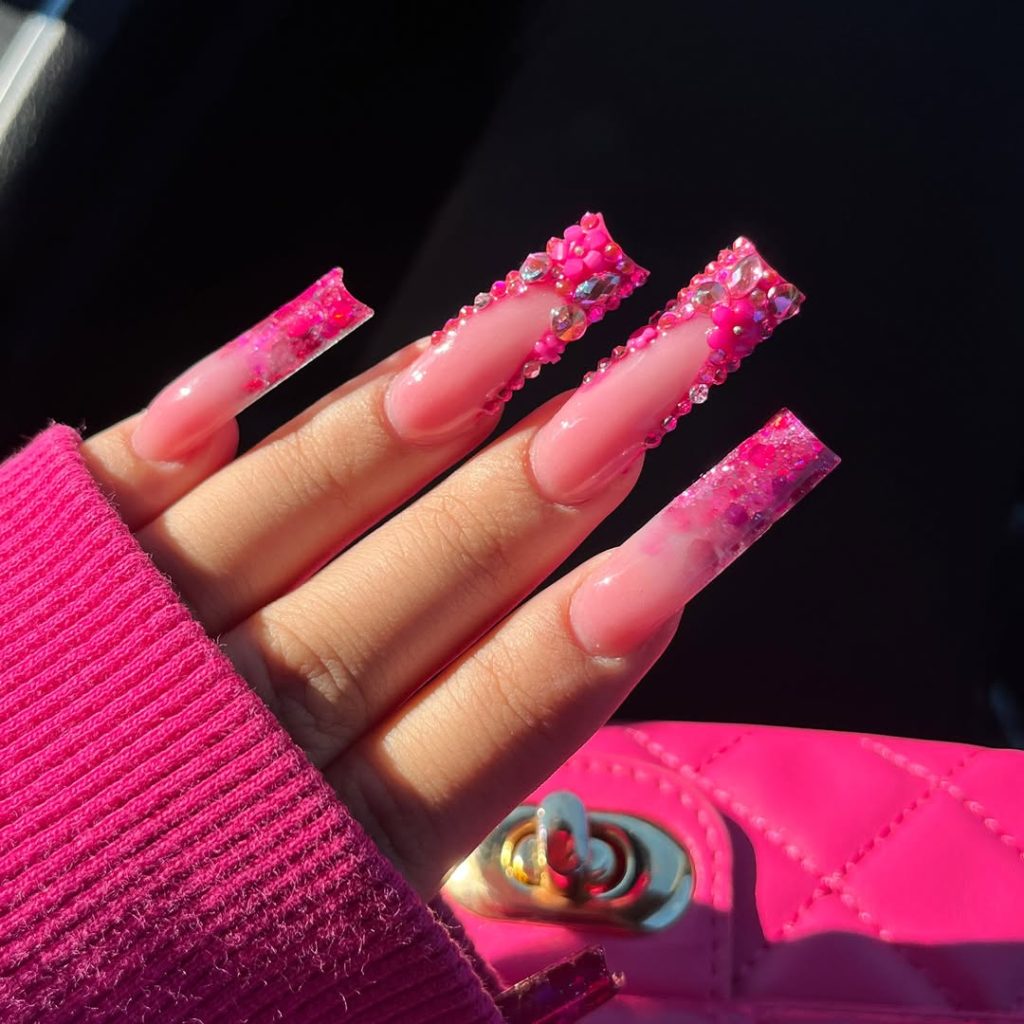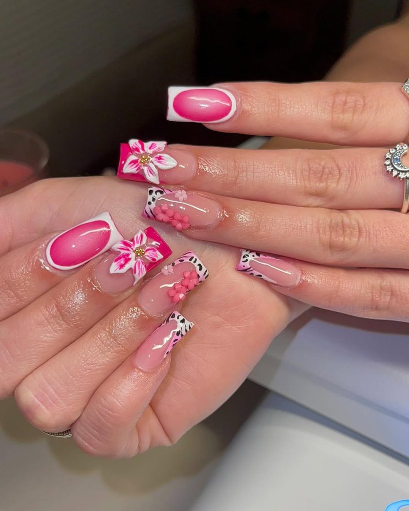 Ask for: “Square Acrylic , hot-pink jelly and opaque mix, white outlines, 3D floral Art , animal-print corners.”