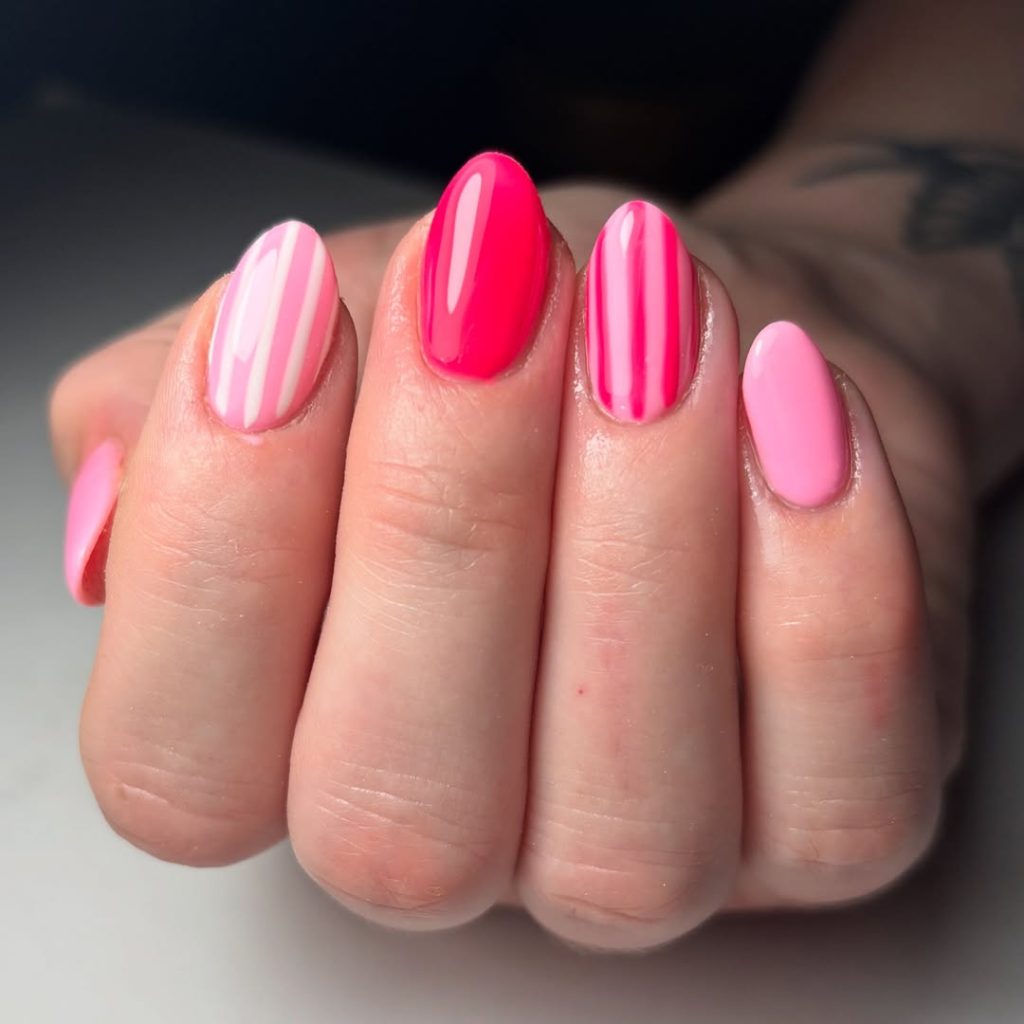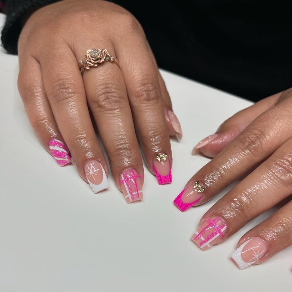 A curated set of mini- Art stories: hot-pink panels, white-and-pink striping, micro stars, and a tiny gold charm. The shorter squared length feels downtown and practical for typing. Ask your tech for a “curated set” where each nail riffs on the same palette for effortless cohesion.
