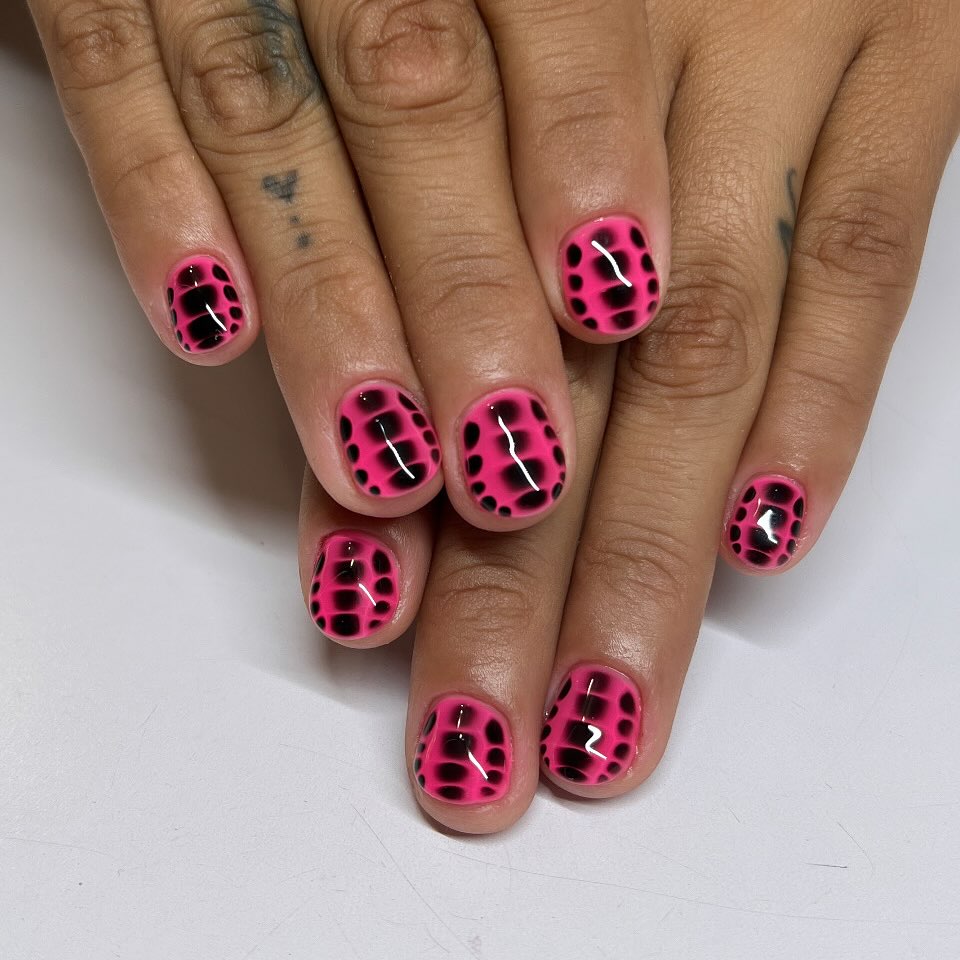 The coolest street-style moment: airbrushed hot-pink halos with black croc-style cells, sealed to a high shine on compact rounded shapes. It’s punk-meets-Y2K, but office-friendly thanks to the manageable length.