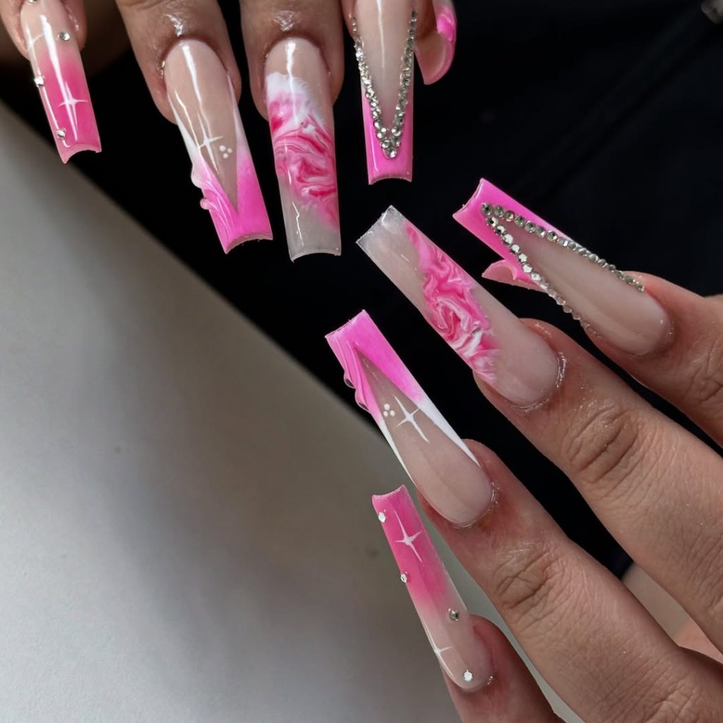 Long tapered coffins serve a high-impact canvas: hot-pink “flame” marbling, milky panels, and V-cut French tip frames traced in micro Rhinestones . A few nails carry minimalist white sparkles—editorial, not cutesy. Ask for a sheer nude base, marble veining in neon and white, then a crystal V to sharpen the silhouette.