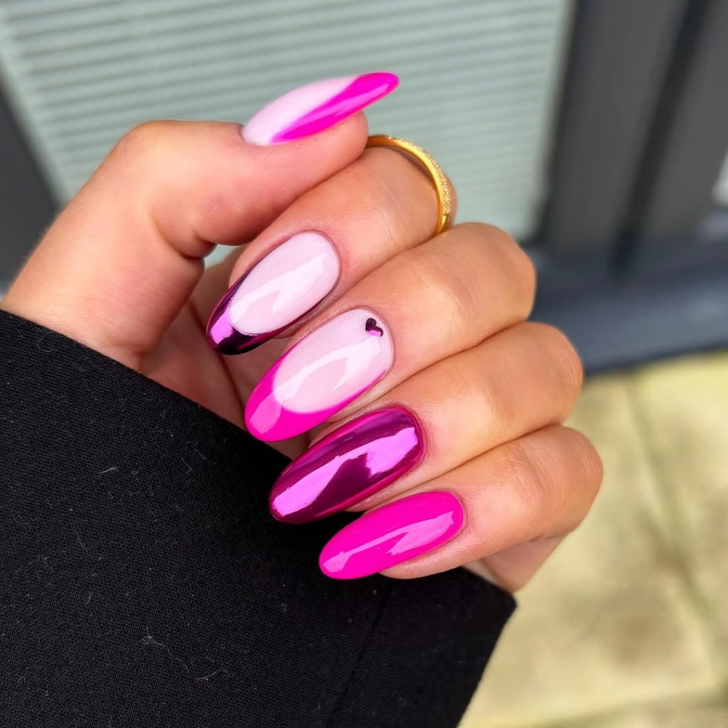 An Almond shape medley: one magenta Chrome nail, a candy-pink solid, a blushed French tip , and a milky nail with a tiny heart. The contrast between mirror and cream finishes is what makes this set sing for 2026 .