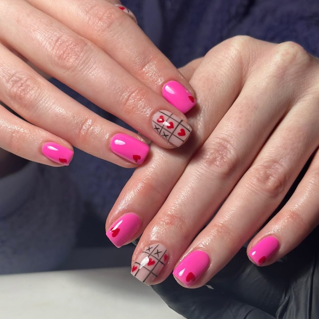 Short rounded nails get a Valentine’s remix: hot-pink jelly, scattered red hearts, and a single nude nail with a tic-tac-toe grid in crisp black lines. It’s charming without feeling tween.