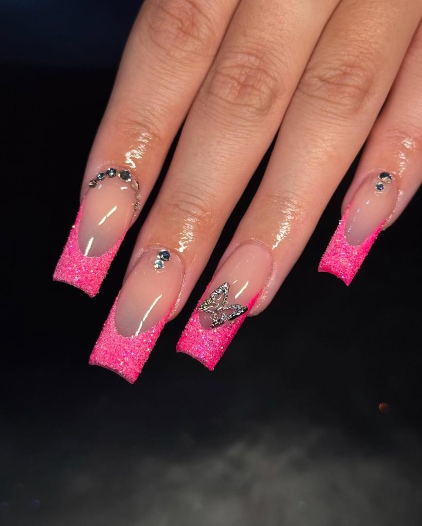 A nude base meets textured neon-pink “sugar” tips and selective gem arcs. One nail flaunts a metallic butterfly over a diagonal tip—girly with grown-up restraint.