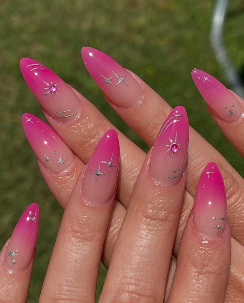 A rosy fade from natural to fuchsia gets sprinkled with silver twinkles and a couple of petite stones. The Almond shape keeps it soft and elongating—an elegant nod to celestial Art that still works Monday through Friday.