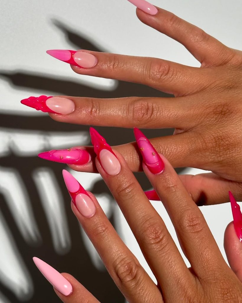 High-fashion stilettos go graphic: hot and light pink panels, liquid-looking drips, and negative-space ovals. Some nails riff on a reverse French tip , others lean into 3D “molten” texture—a runway-ready interpretation of Y2K gloss for 2026 .