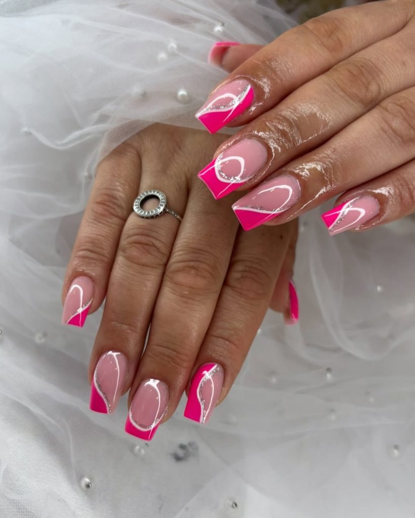 A modern geometric French tip : vivid pink side blocks curve across a nude base, traced with fine white lines and a hairline of silver Design glitter . The short-to-medium square keeps it practical while the swoops feel couture.