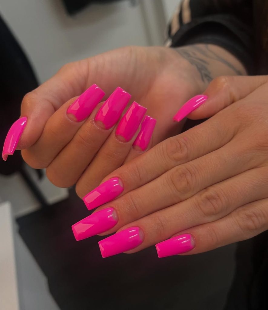 Sometimes the most confident move is a single saturated shade on long coffins. The uniform hot-pink gel looks almost lit from within, and the straight sidewalls give that red-carpet silhouette celebrities love.