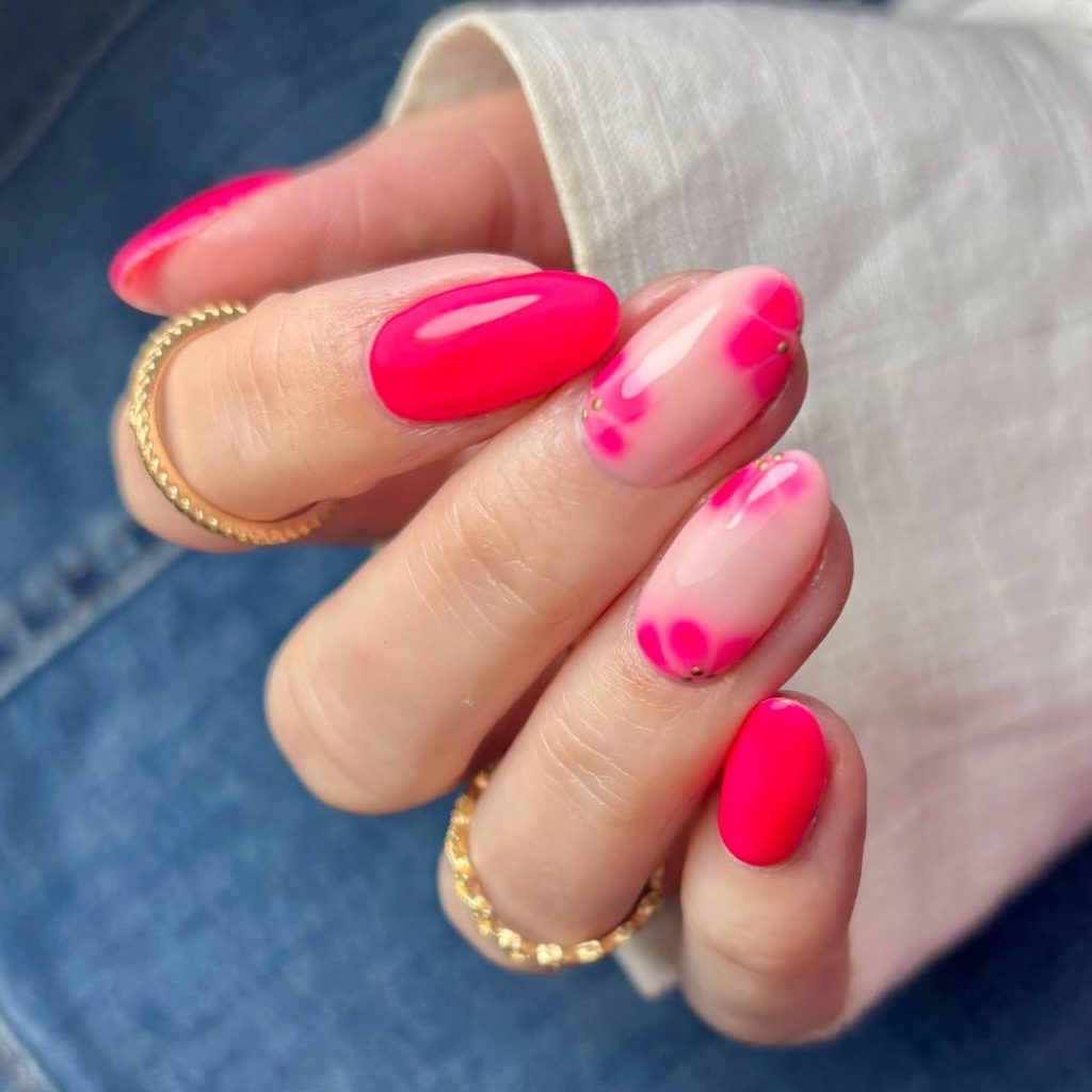 A mixed set that blends full hot-pink nails with milky ovals featuring diffused pink “blush” dots near the cuticle—like watercolor blooms. Tiny gold studs add just enough glint without competing.