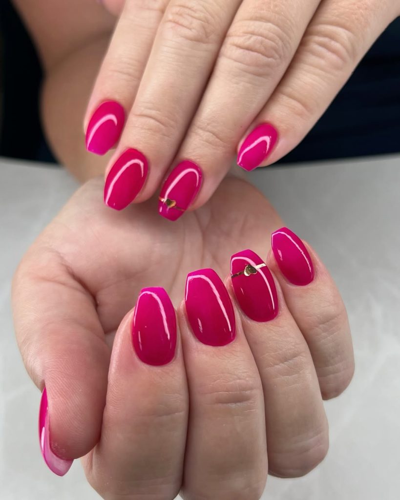 Glossy berry-pink gel becomes jewelry with one subtle gold strip and a petite heart charm across a single nail. The rest remain clean and curved—elevated minimalism you can wear to the office and straight to drinks.