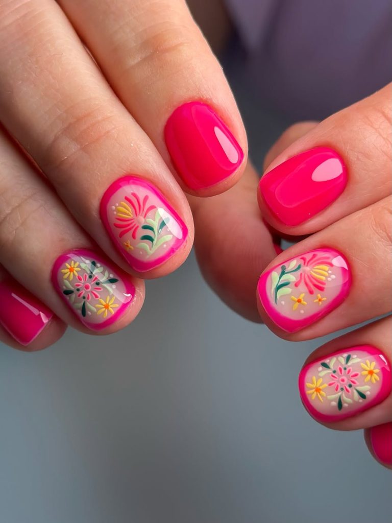 Cheerful accent nails painted with tiny folkloric petals and leaves sit inside hot-pink borders; the remaining nails are glossy pink squares. The compact length is practical for typing, while the hand-painted details make it boutique.