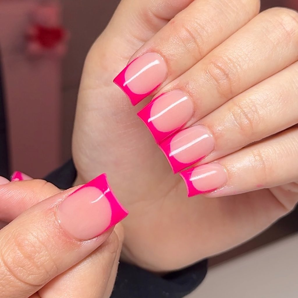 Short, squared nails with graphic half-moon hot-pink tips that leave a clear crescent near the cuticle. It’s a modern twist on a classic French tip that makes hands look fresher and fingers longer.