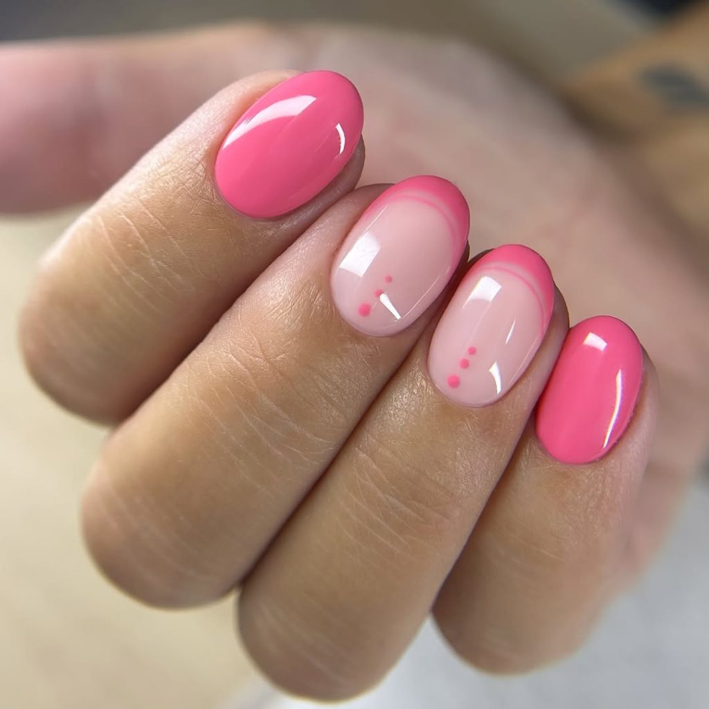 Two nails showcase translucent nude with a rosy smile line and three minimalist dots; the rest glow in creamy pink. The result is airy and elegant—nail Art that whispers.