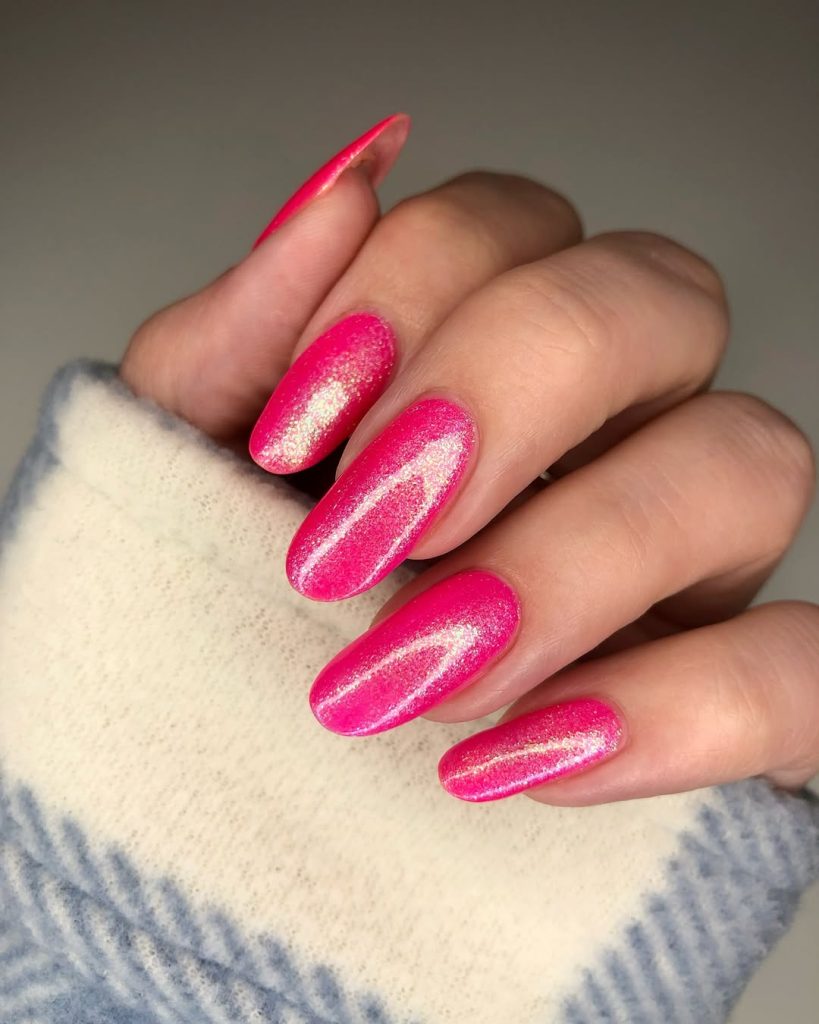 A fine iridescent dust over neon pink creates a lit-from-within sheen—sparkly in sunlight, refined indoors. The oval length keeps it wearable for every calendar invite.