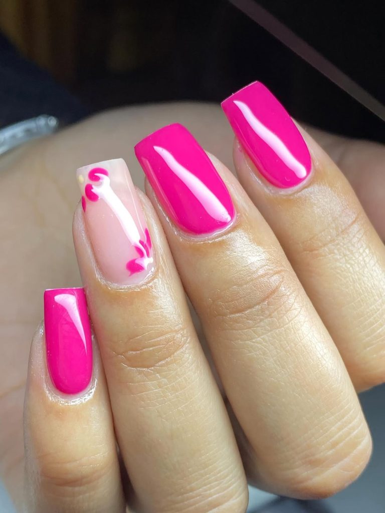 Ask for: “Hot pink almond gel, two sheer petal accents, tiny Rhinestones at the base.”