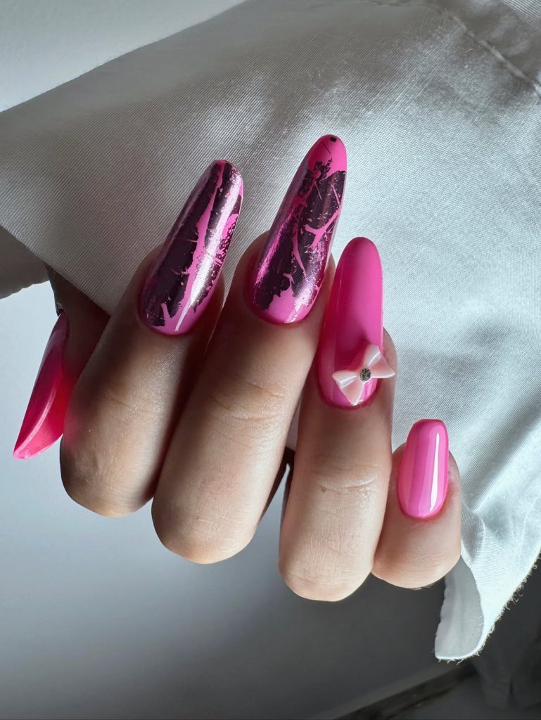 High-impact hot pink meets edgy texture: two nails wear shattered-foil swipes in inky Black and magenta, one is a pure glossy pop, and another features a petite satin bow topped with a crystal—hello, subtle Rhinestones . The elongated Almond shape keeps everything sleek and feminine while the foil adds that grunge-glam contrast editors love in 2026 .
