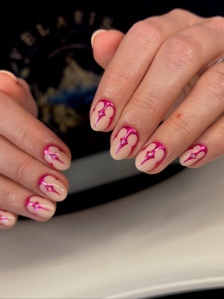 Salon script: “Short oval natural nails; nude base; hot-pink cut-out flames; single crystal accent per nail.”