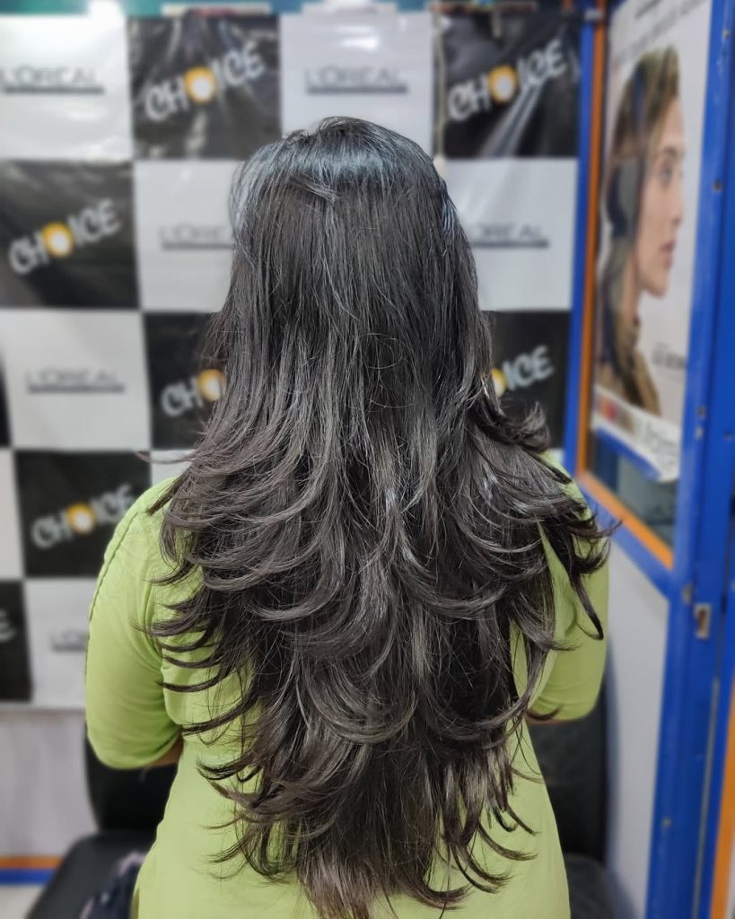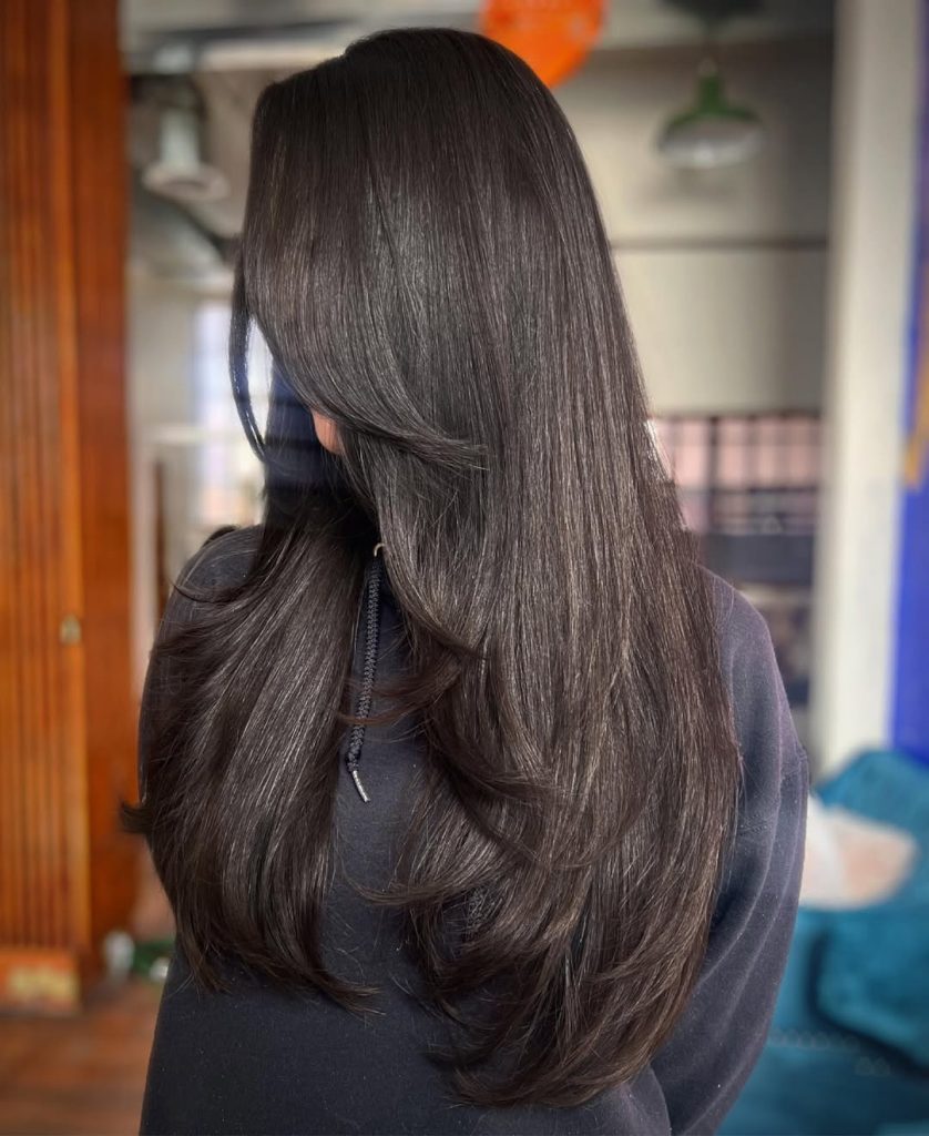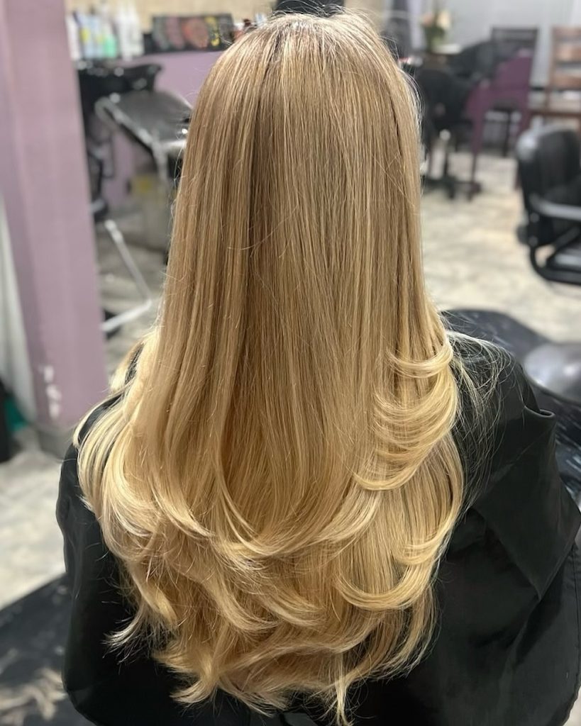 This is the drama queen of long layers: airy, tiered wings starting at the collarbone and fanning to the chest. The perimeter remains long, but the interior is highly graduated, giving that bouncy, salon-fresh flip.
