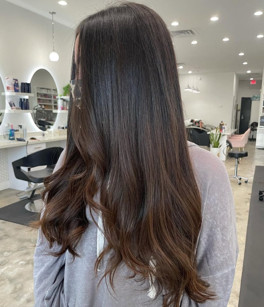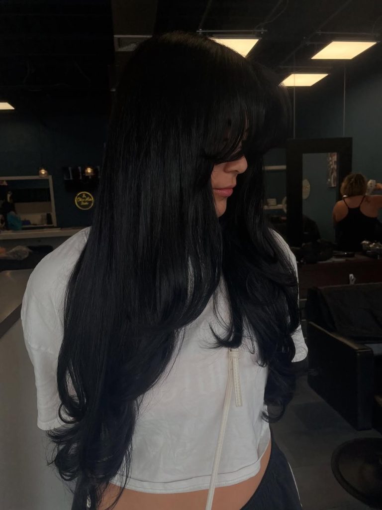 Glassy onyx lengths, beveled ends, and a full, eye-grazing fringe. Minimal layering keeps the outline luxurious, while subtle interior removal builds a gentle flip. If you love sleek hair with a hint of curve, this is it.