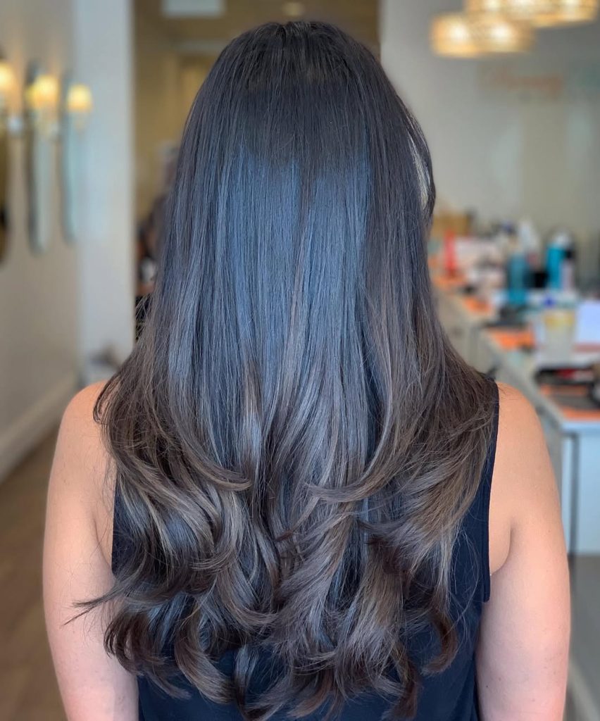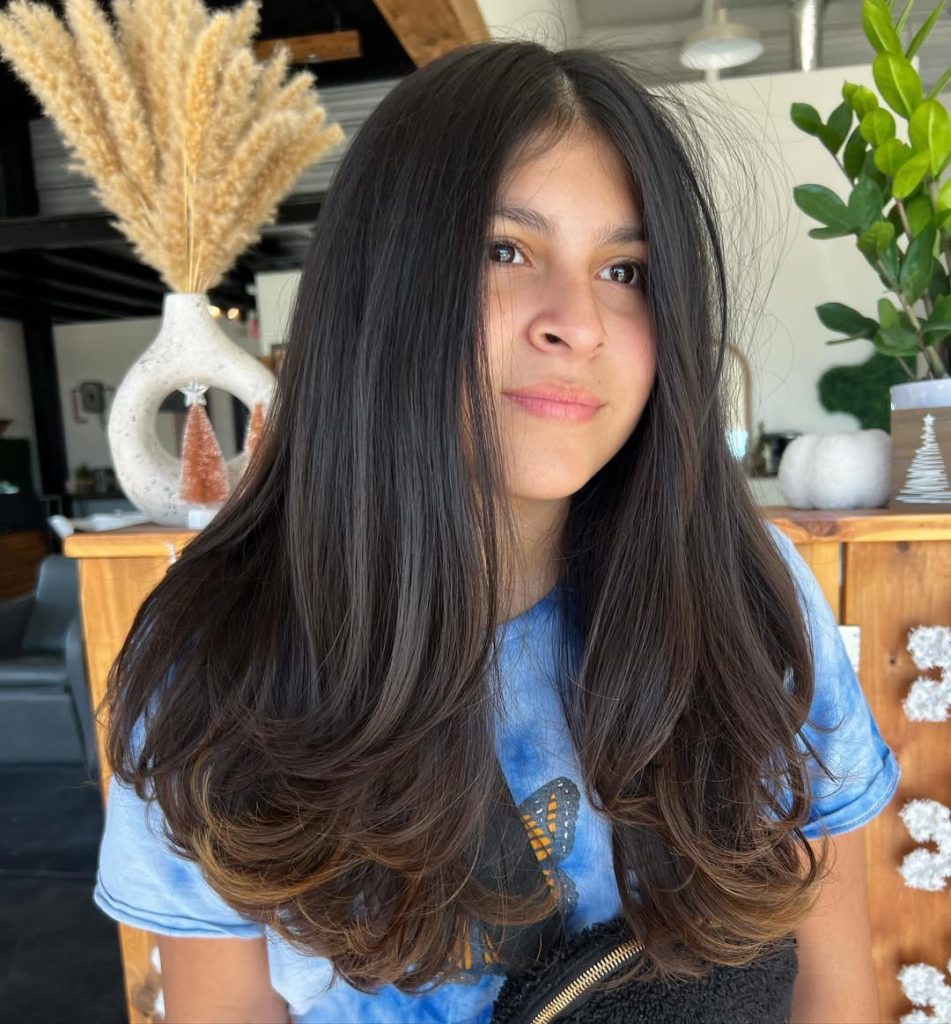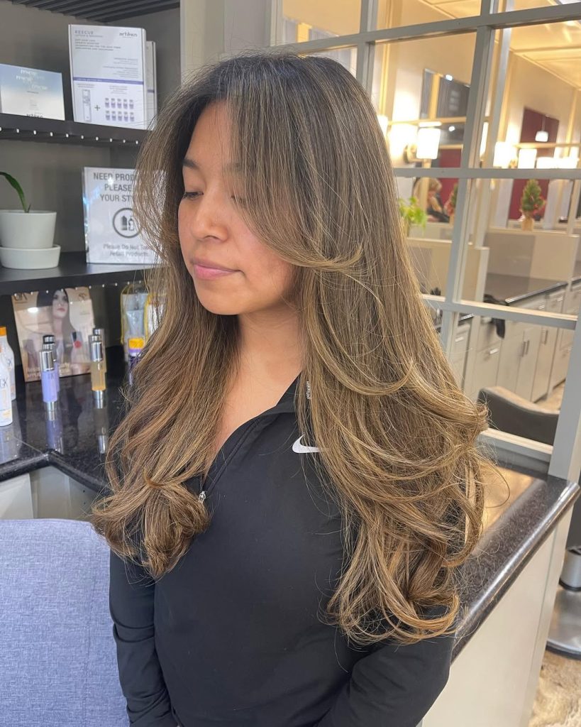 A modern, romantic take on long layers: airy movement through the mid-lengths and ends, plus elongated cheekbone pieces for gentle face framing. The center part keeps everything balanced, while the layers add that “floats when you walk” effect—glam without looking try-hard. Perfect for long hair that sees both heat styling and air-dry days.