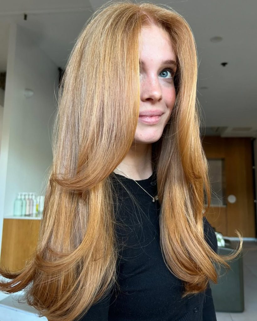 The golden-brown dimension amplifies the cut’s movement, while elongated face pieces contour the cheekbones. Layers begin below the shoulders, preserving fullness while adding a buoyant flip at the ends.