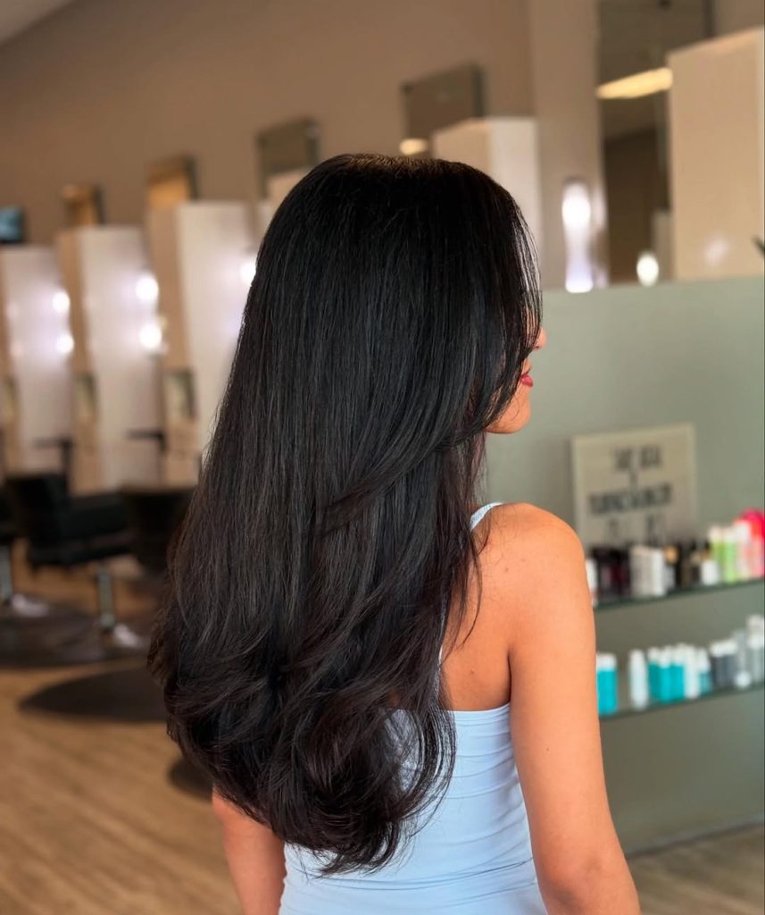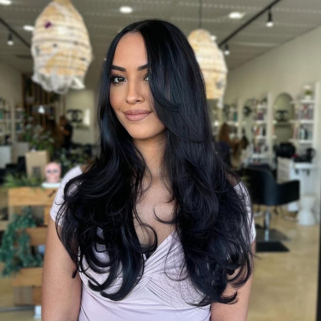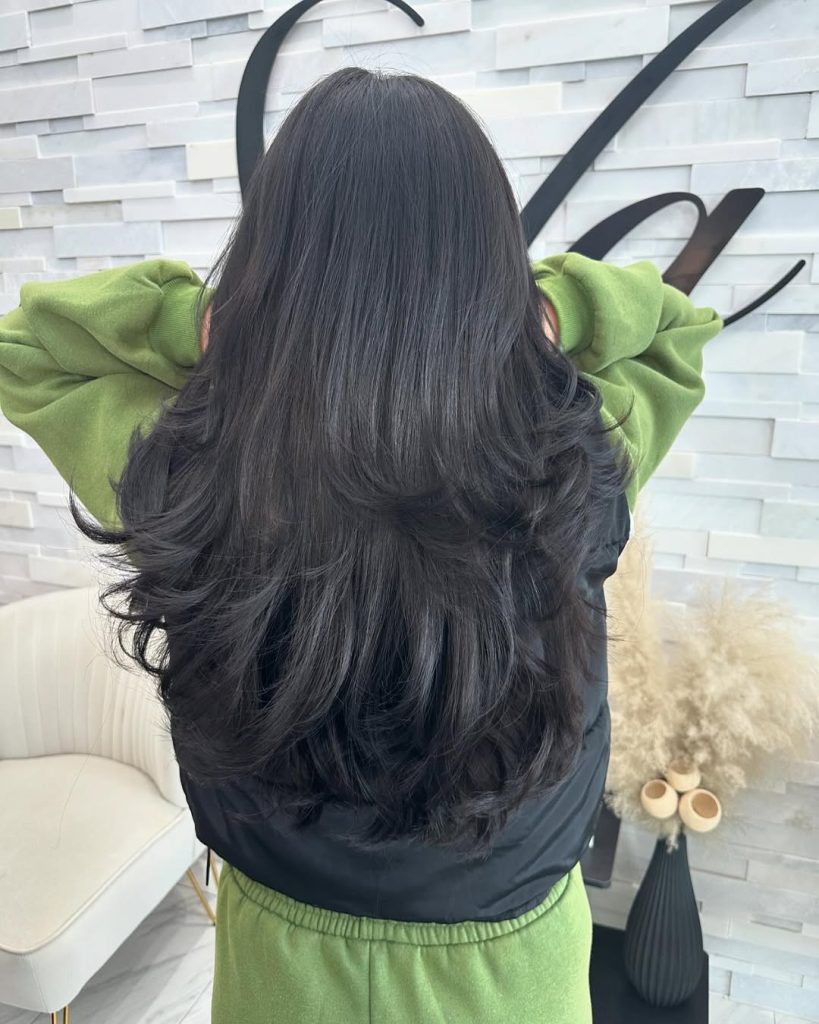 Weightless interior layers create dramatic lift through the crown and a plush, flippy hem. The silhouette reads full and glossy—great for long hair that needs motion without losing length. Ask for soft debulking through the mid-shaft and elongated face framing starting at the chin so it collapses beautifully when styled smooth or waved.