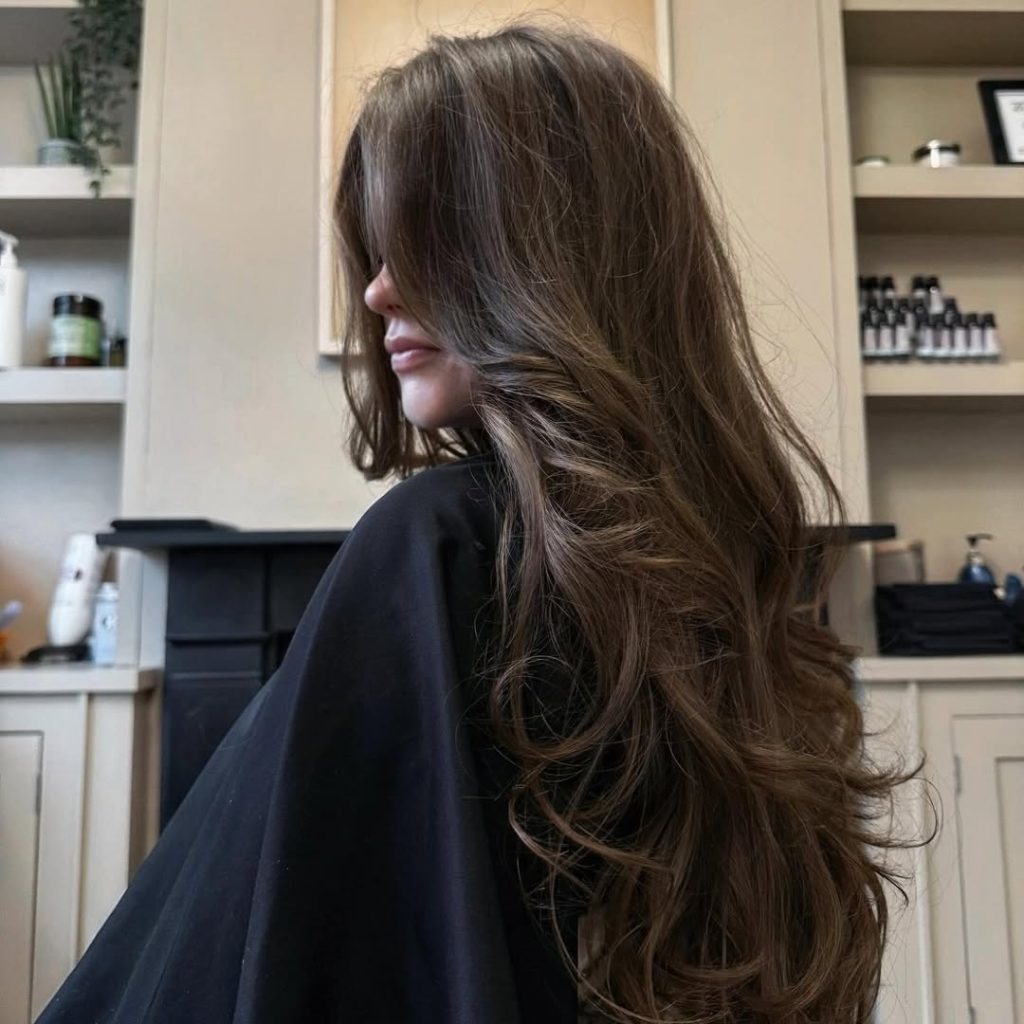 Here, soft body waves meet a parted fringe that opens at the center—true curtain bangs long hair energy. The first layer starts at the upper lip so the fringe blends seamlessly into the lengths.