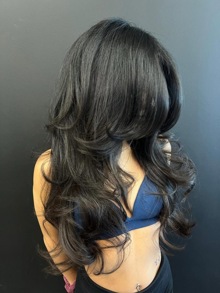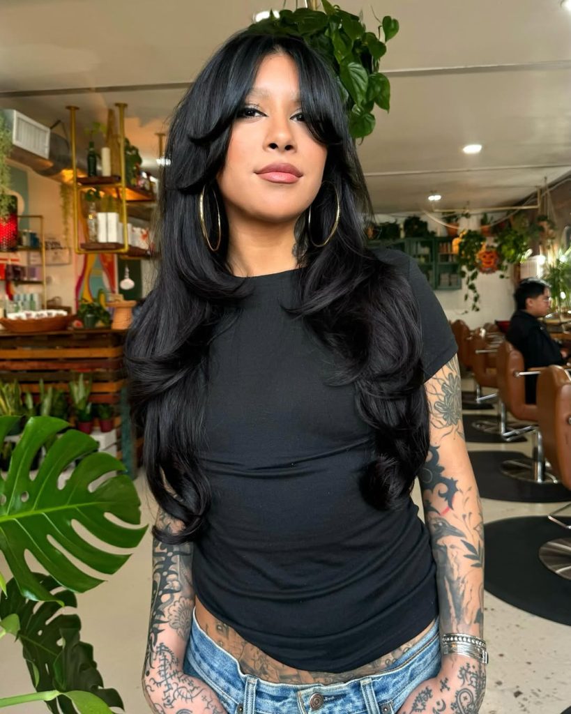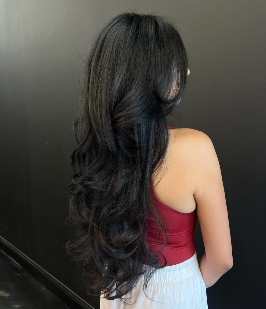 A maximalist butterfly blowout with high, airy tiers and a long, rounded hem. The fringe is cut as drapey Side bangs that veil the eyes, then blend into the first layer—perfect with bangs if you want openness without committing to a short micro fringe. The internal debulking releases weight so dense lengths bounce instead of sitting heavy—gold for thick hair and ultra-long hair.