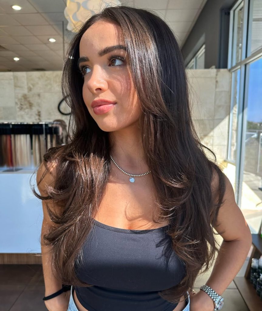 A cocoa-brown cascade with graduated tiers that skim the collarbone and chin for subtle face framing. The layers are long and strategic—ideal if you want everyday polish more than high drama.