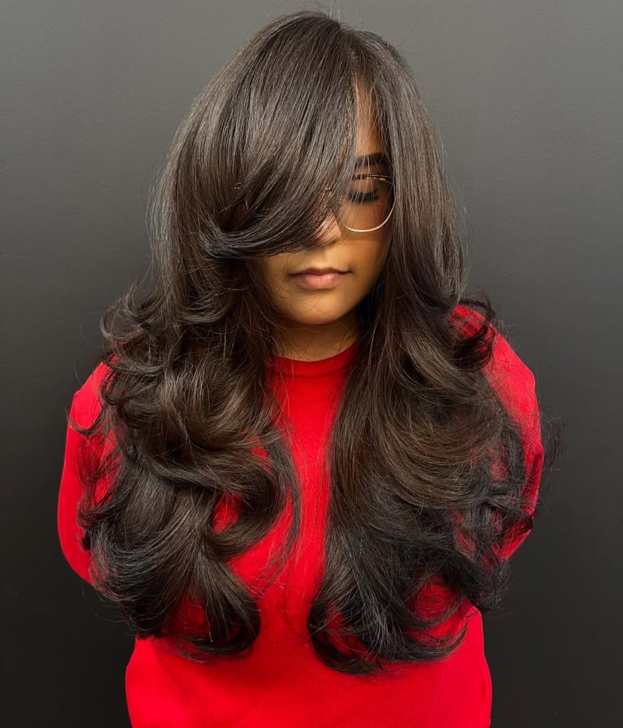This one celebrates sleekness: a deep side part with elongated, side-swept layers that carve a diagonal across the cheekbone. The outline is long and luxe, and the layers are subtle and precise—perfect for modern minimalists.