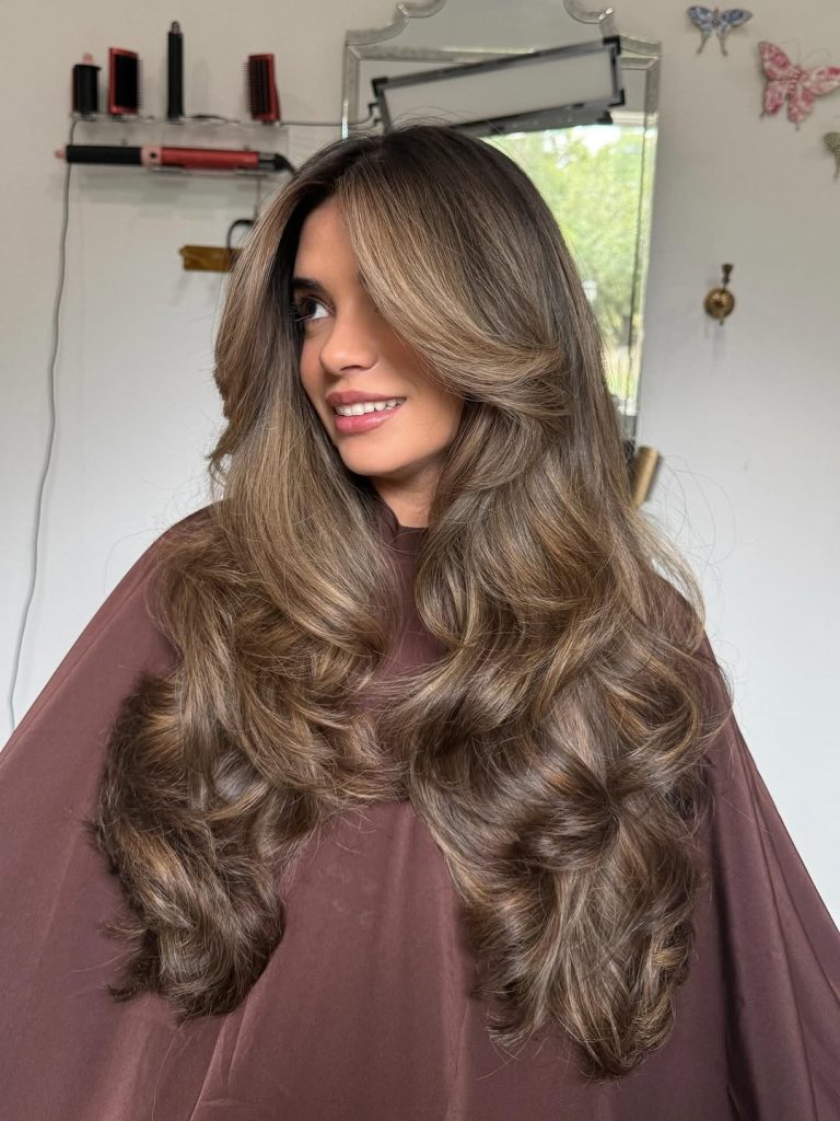 Subtle, elongated layers create an elegant U-shape that swishes without thinning the ends. A soft center part with long, face-skimming pieces gives understated face framing—think model-off-duty polish. This option is great for long hair that’s medium density or for thick-haired clients who prefer a low-maintenance finish. Ask your stylist to keep layers long and graduated, with light internal debulking just at the mid-shaft. Blow-dry smooth with a paddle brush, then add two or three loose bends through the mid-lengths; it’s effortless, office-friendly, and timeless for 2026.