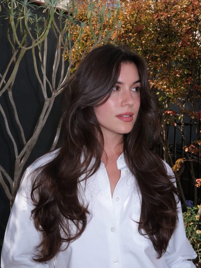 Long, ribbony layers build a romantic cascade, while a gentle side sweep opens the face—hello, subtle side bangs. The cut keeps fullness through the perimeter, so even finer textures feel lush.