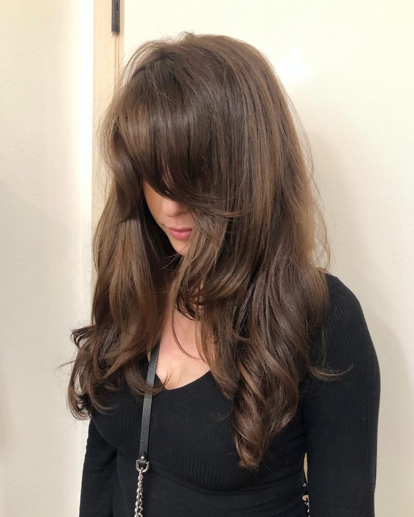 This look pairs long, cascading layers with a dense, cheek-skimming fringe that parts naturally. Textbook Curtain bangs on long hair. The secret is a lighter interior and slightly weightier perimeter so the ends curl under while the lengths keep a relaxed bend. Ask your stylist to over-direct the front sections for face framing that melts from the fringe into the first layer.