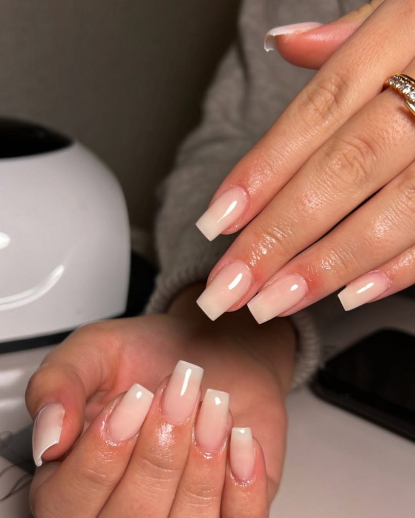 Here, the shape shifts to a modern soft Square with just a whisper of taper at the edges. The color gently fades from a more opaque nude at the tips into a sheer, natural base near the cuticle—a subtle ombré that feels like a quiet nod to French designs without the stark white. The shine suggests either gel or sculpted Acrylic , making this manicure both durable and high-impact.
