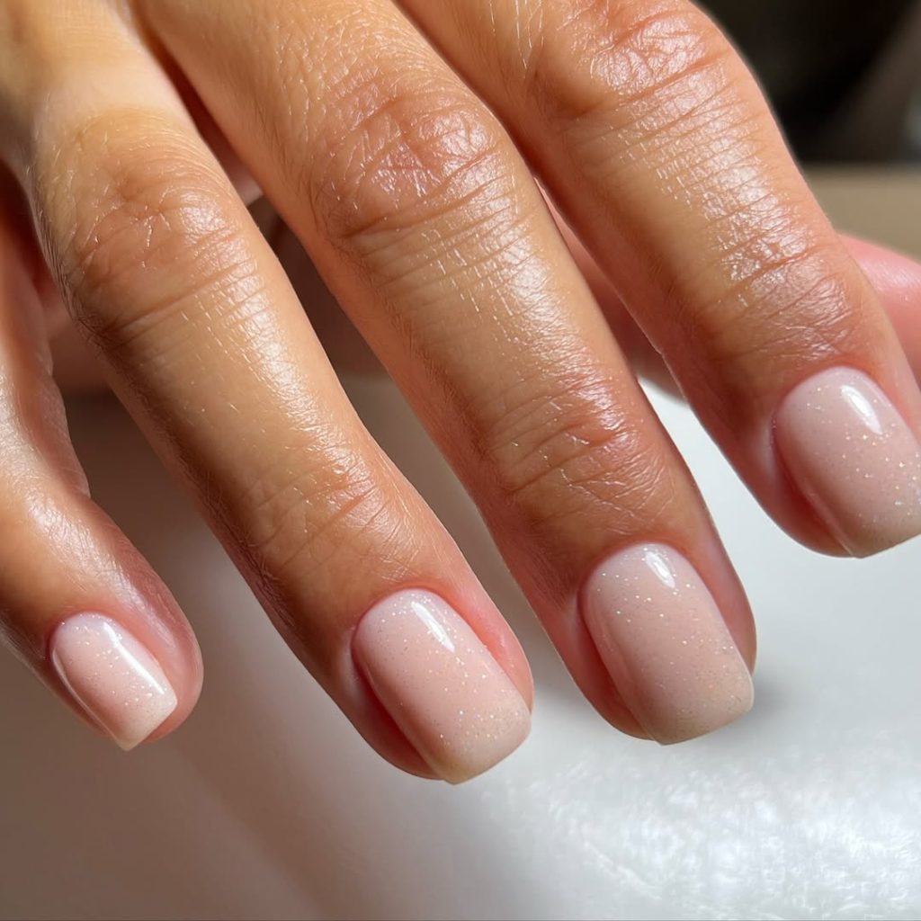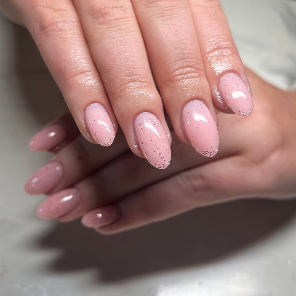 This manicure leans into a gentle blush tone—a neutral pink that still feels understated but a little sweeter. The nails are medium almond with a glossy base and delicate, scattered glitter along the tips and toward the free edge. The shimmer is fine and airy rather than chunky; the effect is more like fairy dust than disco ball, adding a playful sparkle while keeping the look wearable.