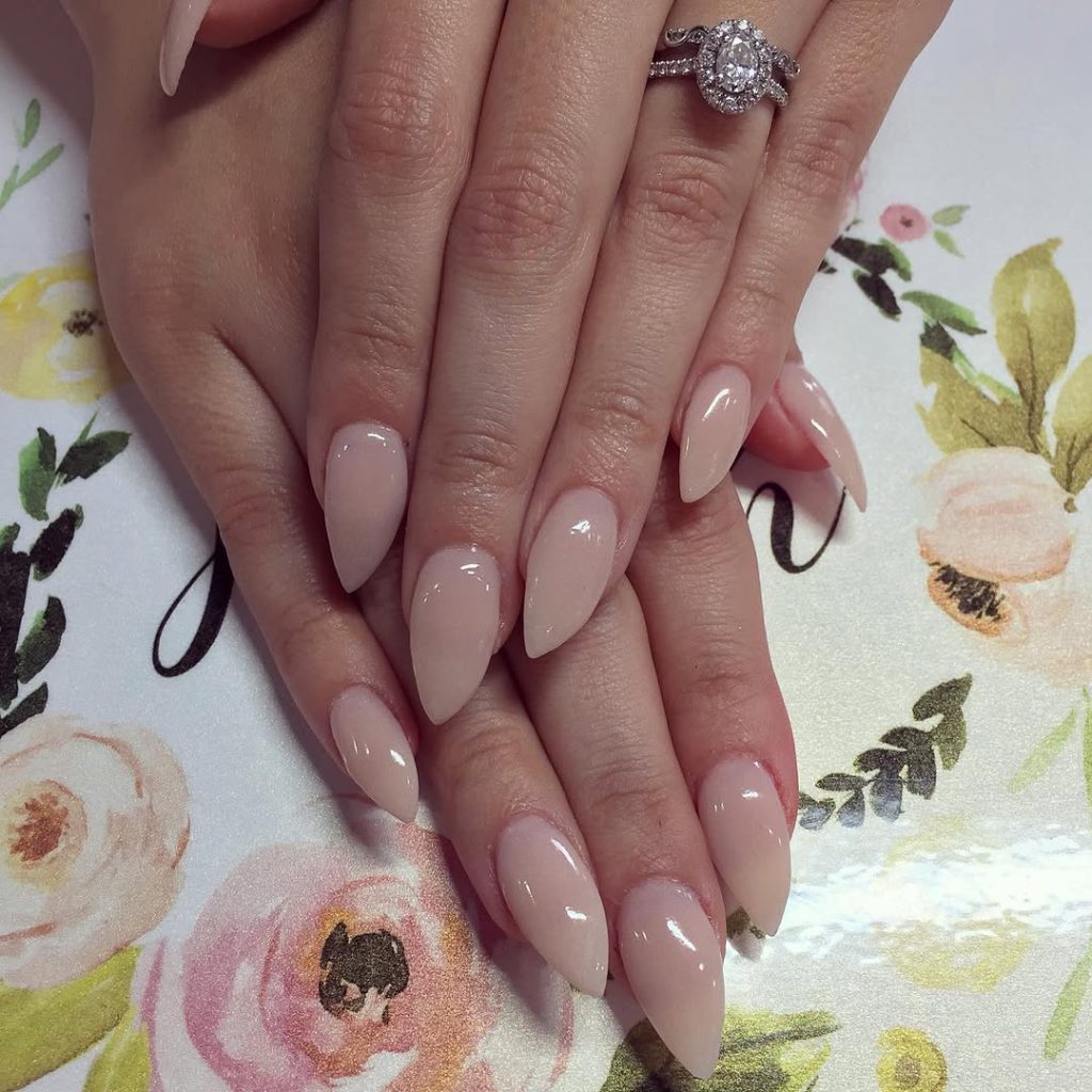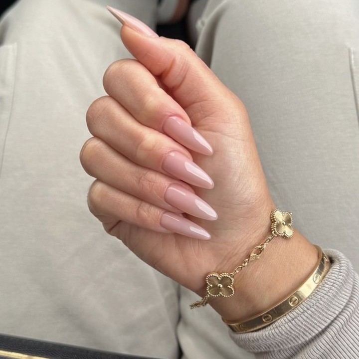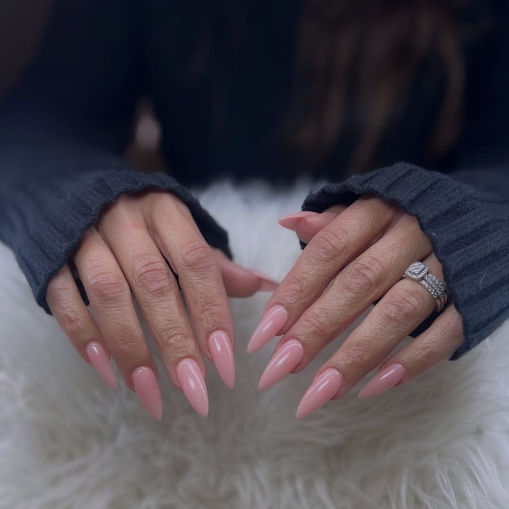 Here, the neutral story turns more dramatic. Long, pointed almond nails are painted in a creamy rosy nude with a high-shine finish, likely built with acrylic or sculpted gel for strength. The length and silhouette bring serious “main character” energy, while the color keeps everything soft, wearable, and unmistakably classy. The outcome is quiet luxury with a little extra attitude.