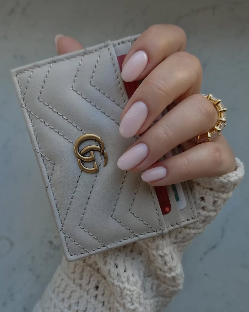 This look is a love letter to soft-luxe style. Medium almond nails are coated in a sheer cashmere pink that leans neutral rather than girly, finished with a glassy gel top coat. The shade echoes the soft tones of knitwear and leather accessories, which makes the whole hand look curated and intentionally styled. It’s understated but has very much “I read fashion newsletters over my morning latte” energy.