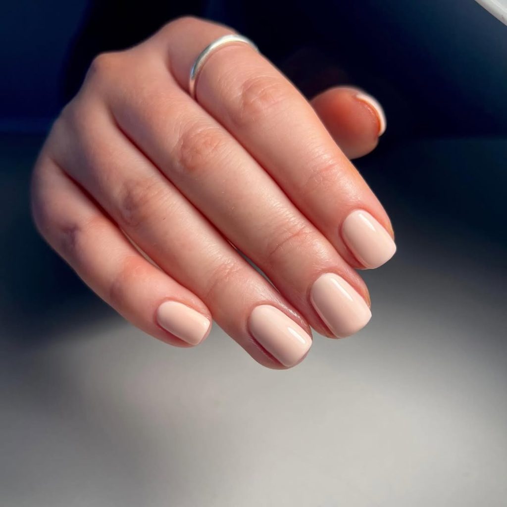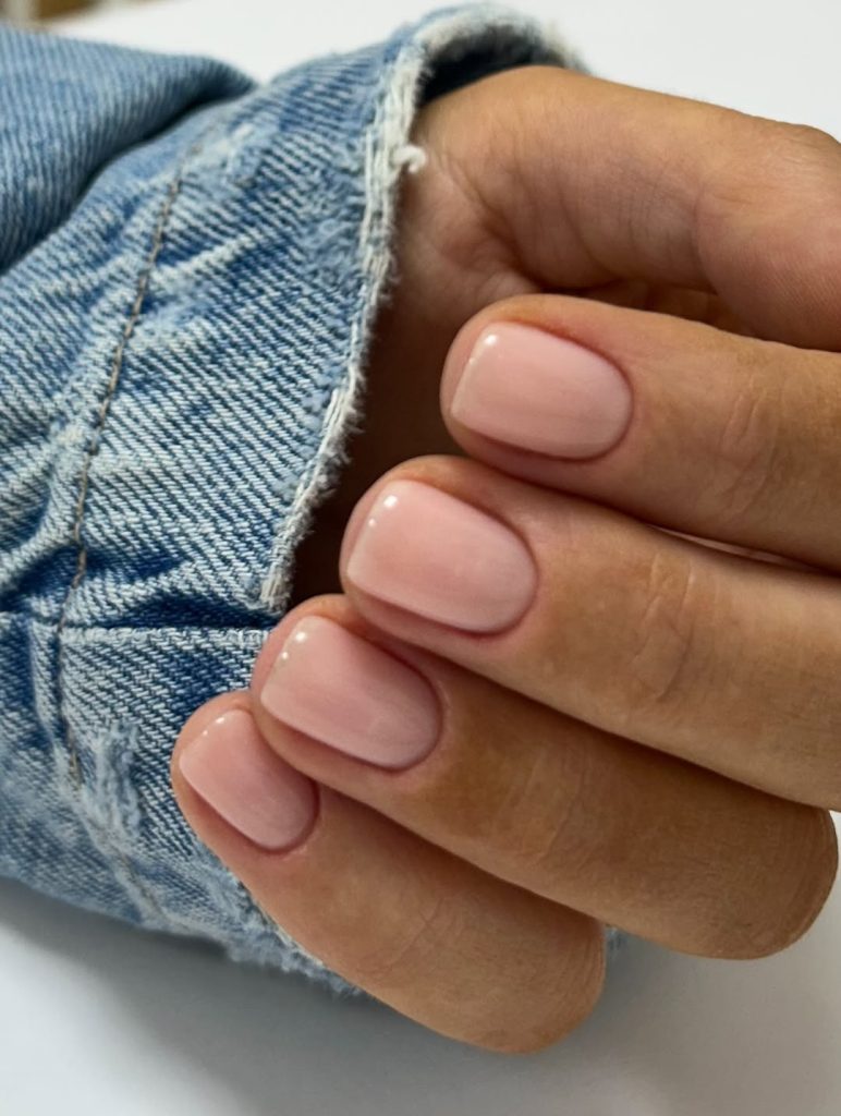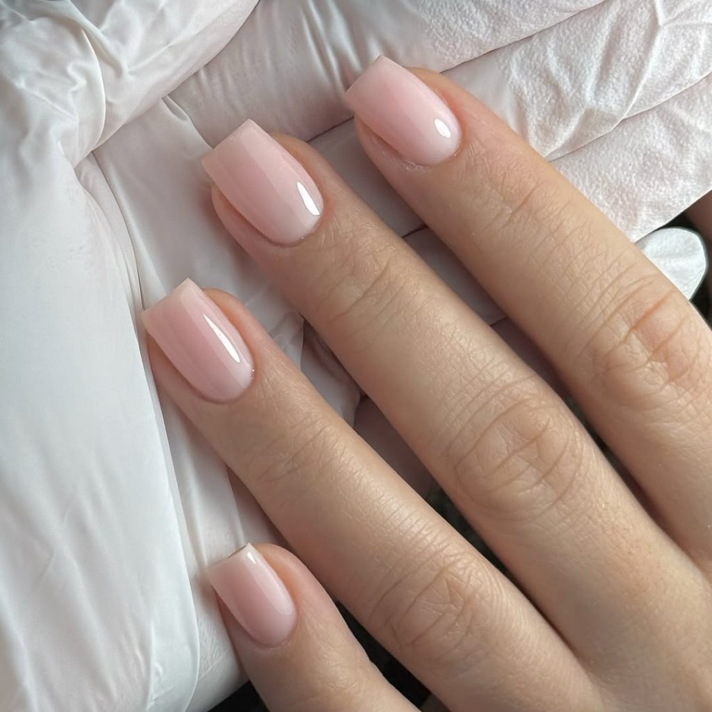 These nails are the definition of polished minimalism. The length is neat and short, shaped into a micro square that hugs the fingertip. A soft baby-pink gel gives an even, creamy coverage with a subtle shine—no glitter, no accents, just a clean, professional finish. It’s the kind of manicure that looks at home everywhere from PTA meetings to client pitches.