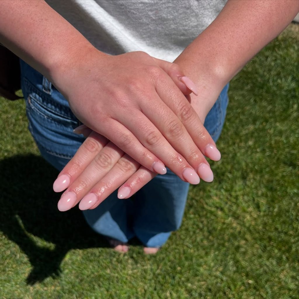 This set feels like a weekend spent outside. Medium-length almond nails are coated in a translucent neutral pink that looks especially luminous in natural light. The shine suggests a flexible gel overlay—perfect if you’re active but still want a touch of glamour. It’s relaxed, wearable, and just cute enough to feel special every time you catch a glimpse of your hands.