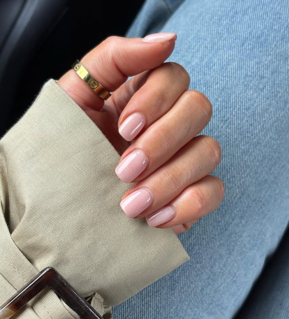 This set is all about effortless shine. The nails are short and softly rounded into a micro-square shape, coated in a milky nude-pink shade with a veil of fine sparkle. The shimmer is delicate, not chunky, so the overall effect is still very simple and wearable—just a tiny hint of glamour that catches the sun when you’re driving or grabbing coffee.