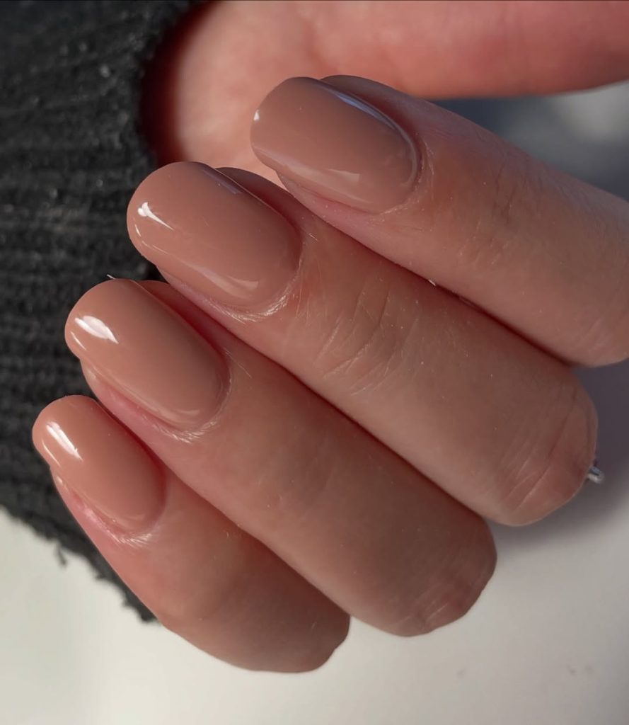 Here the neutral palette deepens into a chic café au lait tone. Short, rounded nails are painted in a creamy tan that leans brown, with a high-gloss finish that makes the color look almost edible. It’s sophisticated without being harsh, and it plays beautifully against knitwear and wool coats once temperatures drop.