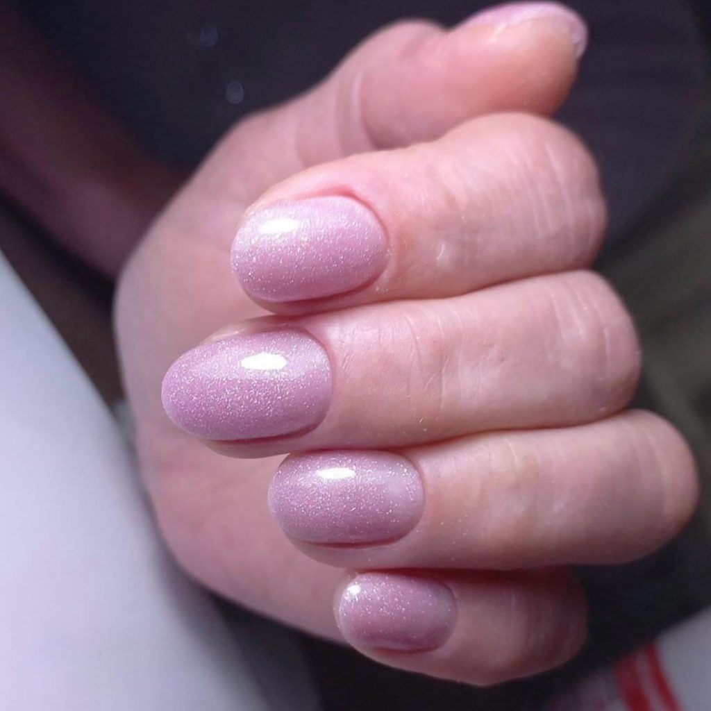 This manicure leans into a cooler, lilac-tinted nude pink packed with ultra-fine shimmer. The shape is softly rounded and practical, but the finish is undeniably sparkly—still refined, yet more playful than a flat nude. It’s the kind of look that feels especially right under evening lights or at a holiday dinner.