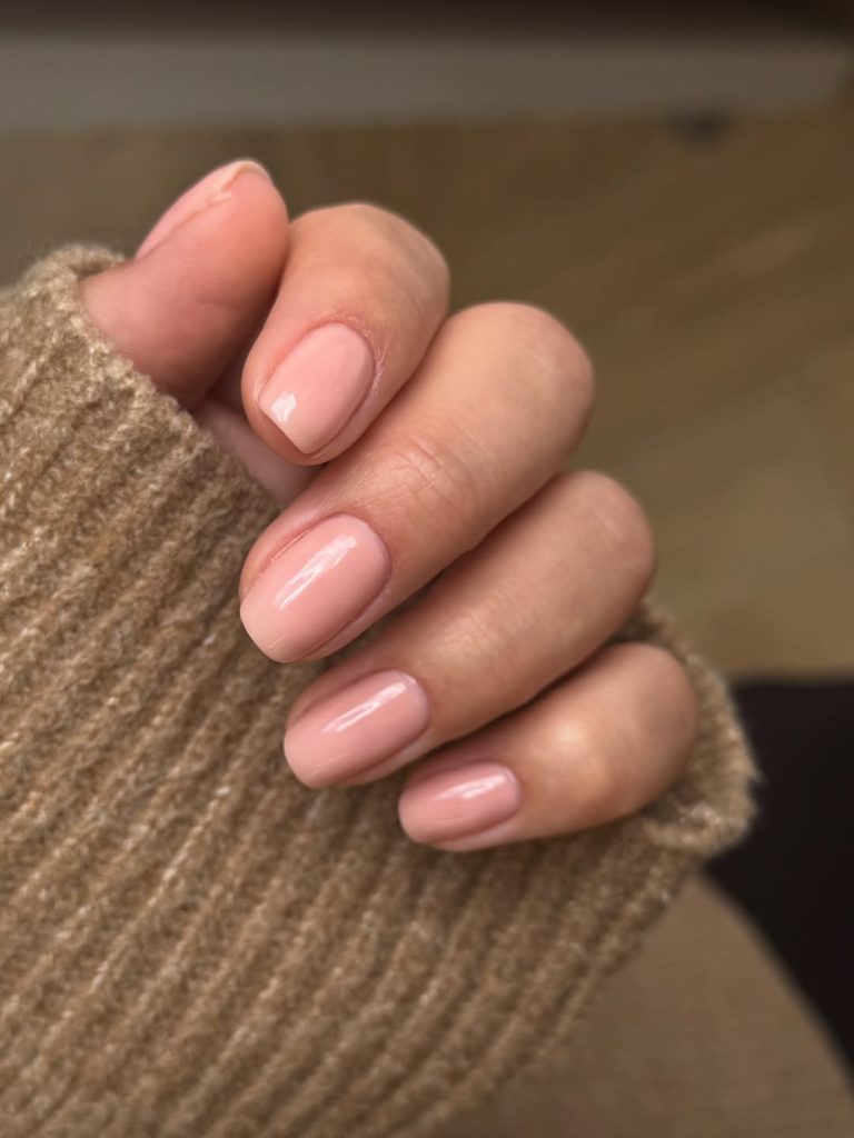 The final look is all about cozy sophistication. Short, rounded nails are painted in a warm peach-nude that sits somewhere between beige and blush. The finish is creamy and glossy, with no glitter or embellishment—just a smooth, skin-flattering shade that makes hands look soft and well cared for. It’s incredibly pretty in a quiet way, like your favorite sweater in nail form.