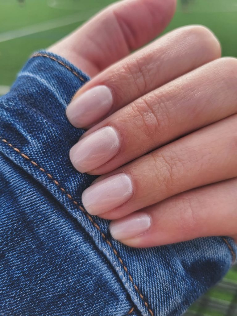 This look feels like an effortless Saturday at the park. Nails are softly rounded and kept short, coated in a sheer milky nude that lets a hint of the natural nail peek through. There’s the faintest touch of sparkle in the finish, just enough to catch sunlight when you move your hands. The result is ultra-simple and low-maintenance but still polished enough to look intentional.