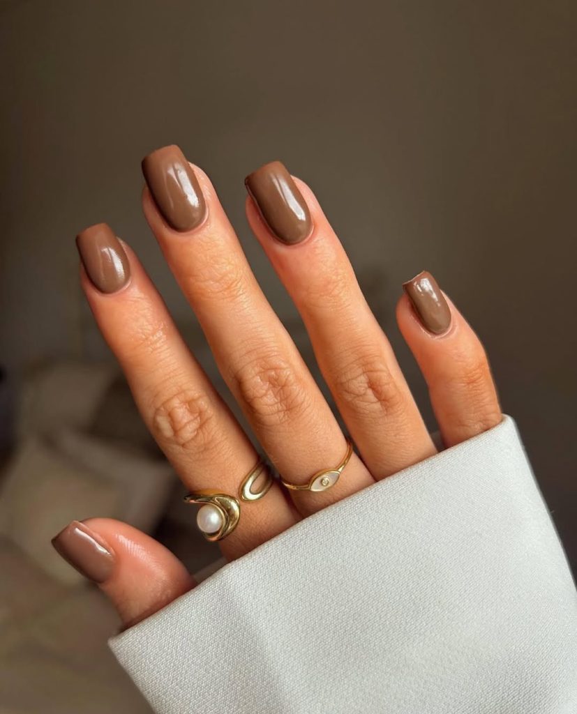 The final idea explores the deeper side of neutrals. Medium-length square nails are coated in a glossy espresso brown that looks almost like melted chocolate. The high-shine polish gives a mirror-like finish, making the color feel rich and sophisticated rather than heavy. It’s a perfect example of how neutral colors can still make a strong style statement.