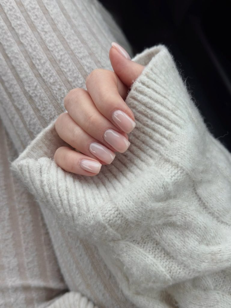 This look is pure comfort dressing in manicure form. Medium-short nails are shaped into a soft square with rounded edges and coated in a sheer nude-pink gel that looks almost like a clear gloss over your natural nails. Against the creamy cable-knit sweater and tonal ribbed pants, the soft shade feels incredibly classy and quietly luxurious—exactly the kind of neutral that keeps popping up in mood boards for Fall 2026.