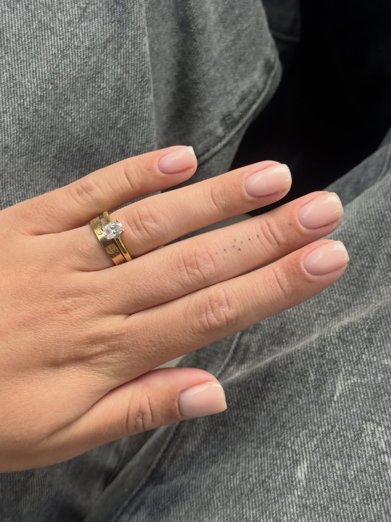 Here, everything is designed to let the rings shine. The nails are kept deliberately short and rounded, with a translucent nude polish that gently blurs the nail plate without hiding it completely. The soft beige-pink tone looks seamless against the skin and makes the gold engagement and band stack stand out even more. It’s understated, modern, and effortlessly elegant—the manicure equivalent of a perfectly tailored grey denim jacket and tee.