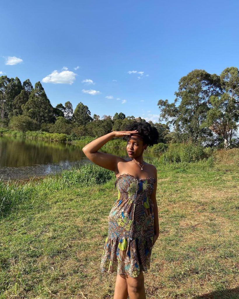 A strapless printed sundress catches the light as the wearer shades her eyes by the water; the look feels carefree, earthy, and made for long, lazy afternoons.