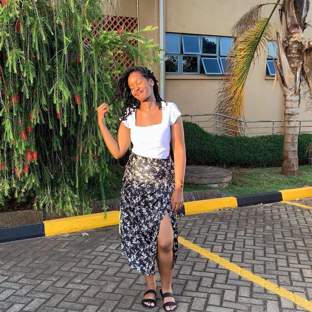 The sun hits a square-neck white tee and a black floral wrap skirt with a front slit, giving the whole look that “I just stepped out for iced coffee and a park moment” glow.