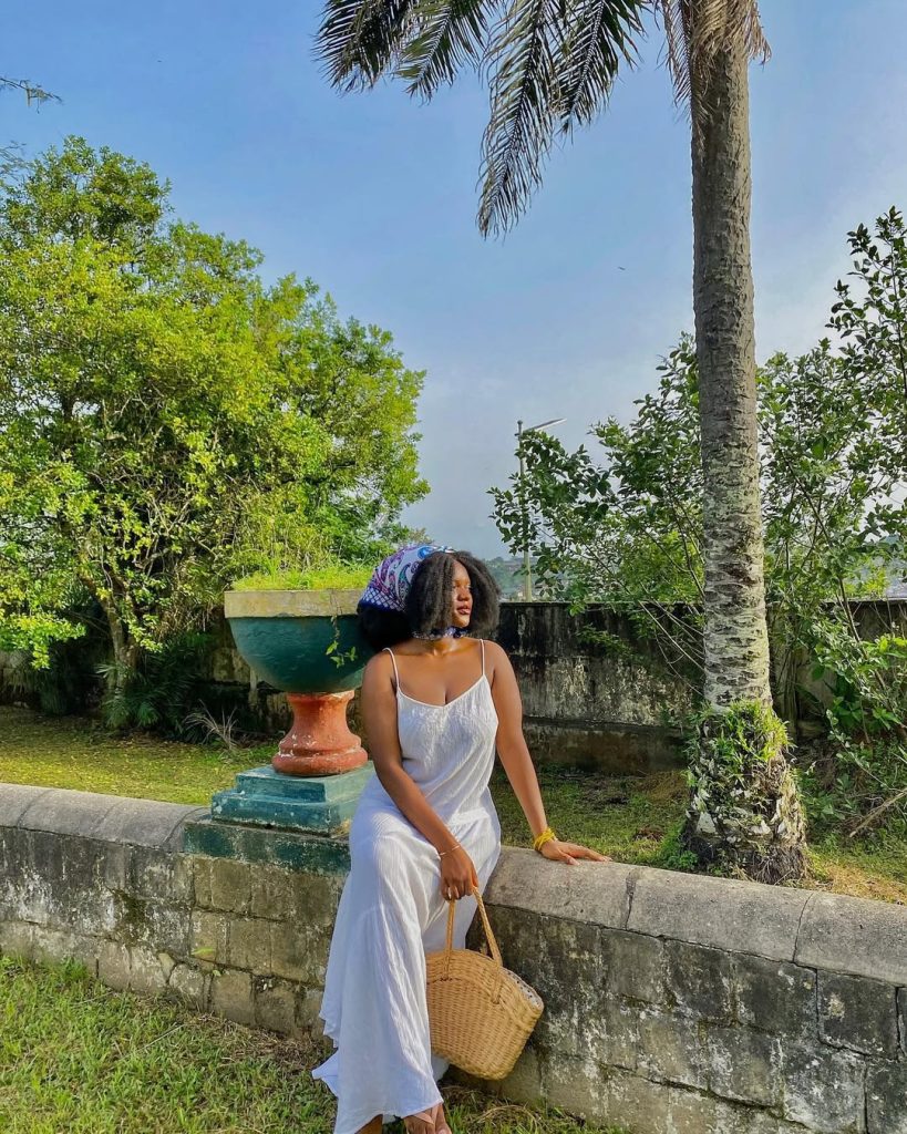 An all-white floor-sweeping slip dress and colorful headscarf exude an exotic feel as if plucked straight out of an old-world European tropical getaway.