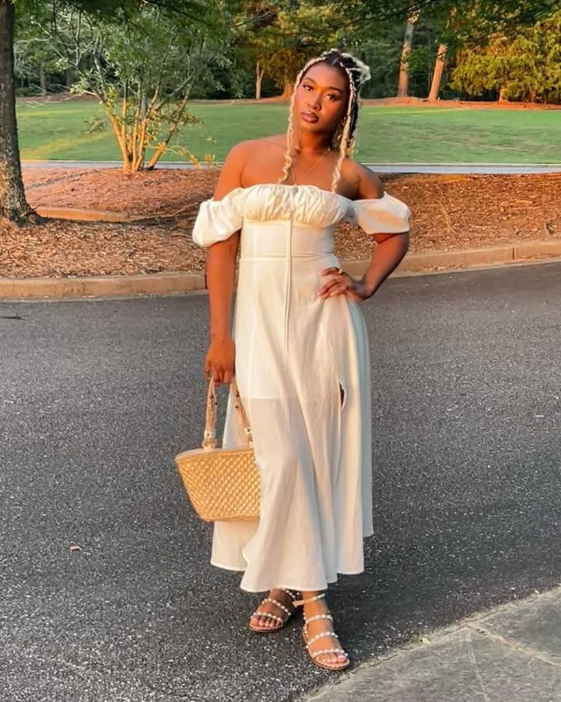 If your idea of the perfect picnic includes a little romance—maybe a date at sunset in a quiet park—this look is a dream. Off-shoulder silhouettes are a big part of picnic outfits in the 2026 trends, including actual romantic picnic dates at sunset in an isolated park setting. One of its romantic traits can be attributed to the fact that it showcases off-shoulder designs, which come in handy in picnics because they beautifully accentuate the collarbone without compromising any level of picnic comfort. Add your own flair with accessories like tan belts or silk scarves around your tote handle. To keep it romantic-looking without instantly aging itself, I wouldn’t dare sport chunky sneakers or heavy cardigans that will go against the ethereal romantic picnic feel of the dress. It would easily translate to picnic dates at placed locations complete with lanterns, bottles of bubbly water, and communal playlists.